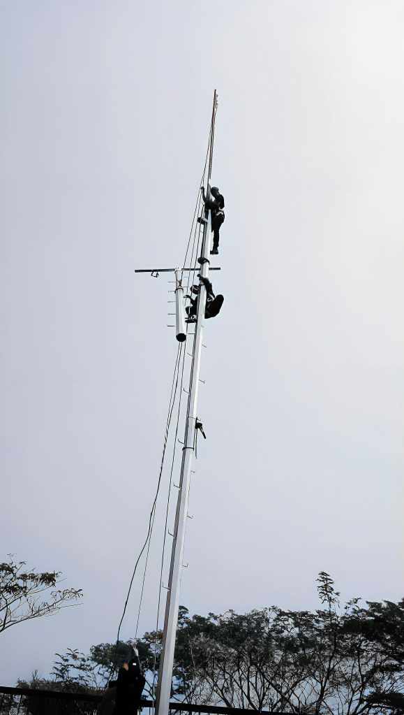 Penyambungan antar segmen tiang lampu high mast dalam posisi vertikal dengan alat kerja pipa, tali tambang, sling baja dan chain block tackle. Metode instalasi mendirikan/erection tiang lampu high mast atau tiang extra tinggi tanpa crane ini dilakukan jika area lokasi pemasangan tiang lampu high mast tidak dapat dijangkau dengan crane.